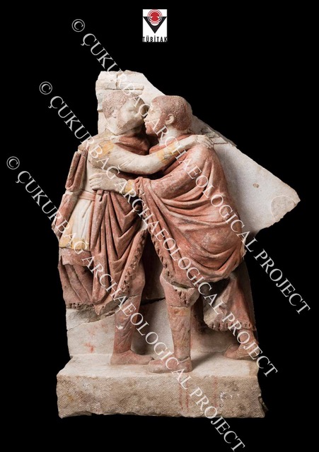 A panel from the painted Nikomedia frieze showing co-emperors Diocletian and Maximian embracing. Nikomedia (Turkey). 3rd c. CE.